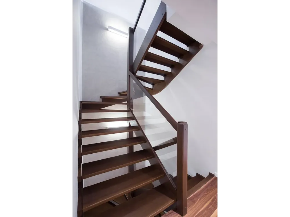 П-образный поворот на 180 градусов выполнен через забежную группу ступеней. Основной материал - дерево. Бук тонирован в темный цвет. Для ограждения использовано стекло толщиной 4мм.