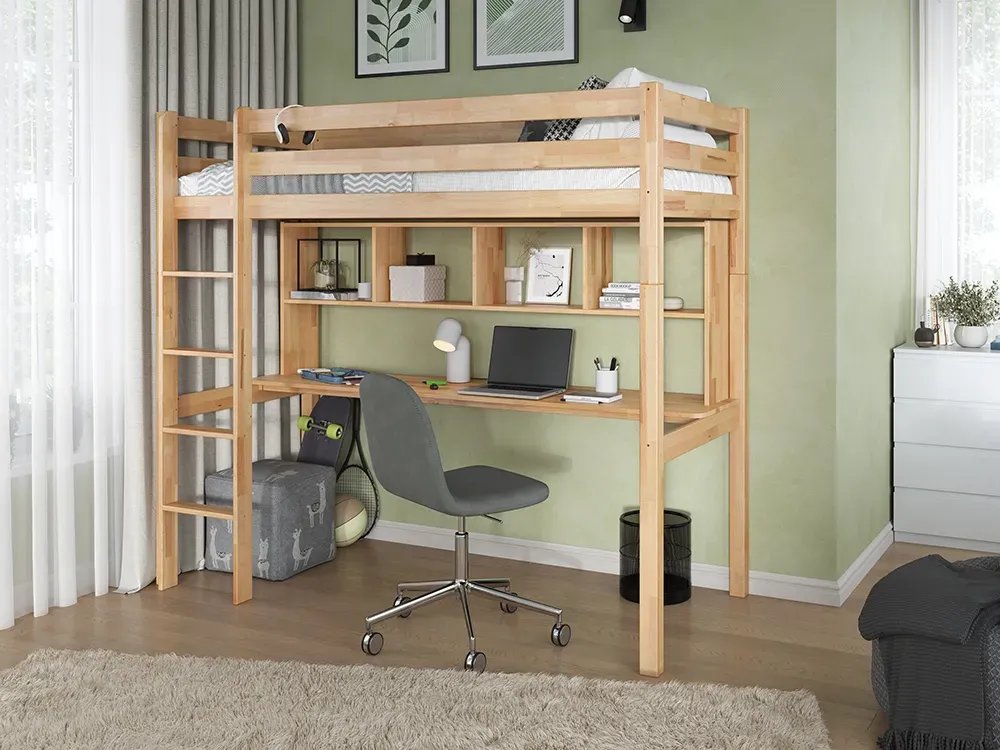 Підліткове ліжко Скай із захисною огорожею та підйомом на 2 поверх, стіл та полиці, натурального кольору (інтер'єр)