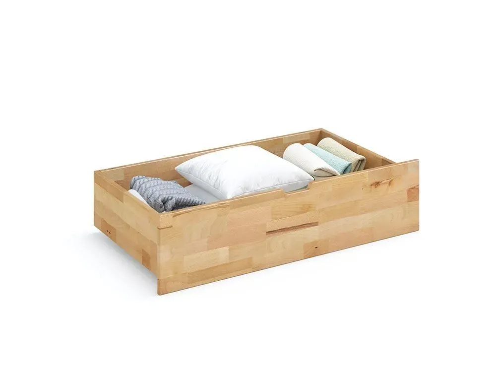 Шухляда виконана із надійного матеріалу - деревини бука. Дно виконане із ДВП. Висота шухляди є фіксованою становить 240 міліметрів. Ширину шухляди покупець може обрати сам: 990 або ж 1300 мм. Шухляда надзвичайно містка, оскільки має глибину в 550 мм. Тому, сміливо можете зберігати в ній постільну білизну, рушники, сезонний одяг чи, навіть, взуття.
