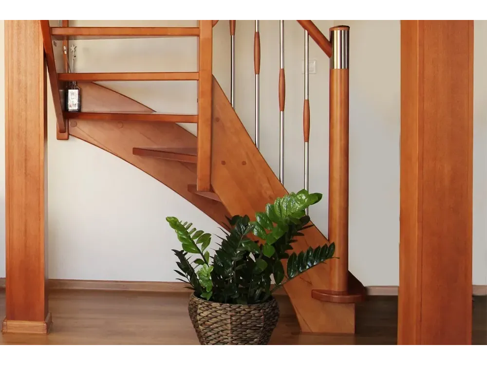 П-подібний поворот на 180 градусів виконаний через забіжну групу сходин. Основний матеріал - дерево - тонований бук. Для огородження використано декоративне поєднання металу (нержавійки) та дерева.