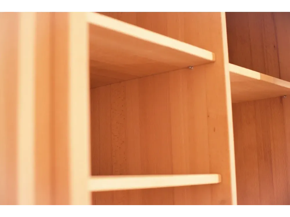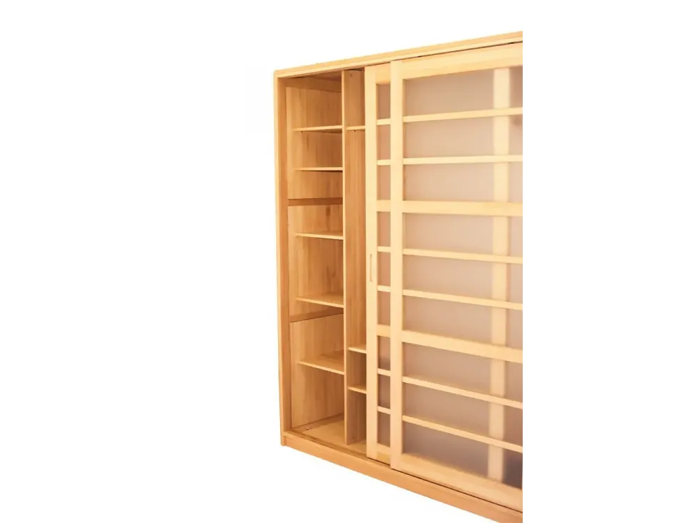 Фасад даної моделі також виготовлений з натуральної деревини зі вставками скла. Дизайн добре гармонує з іншими натуральними меблями, оскільки має природний колір і текстуру.