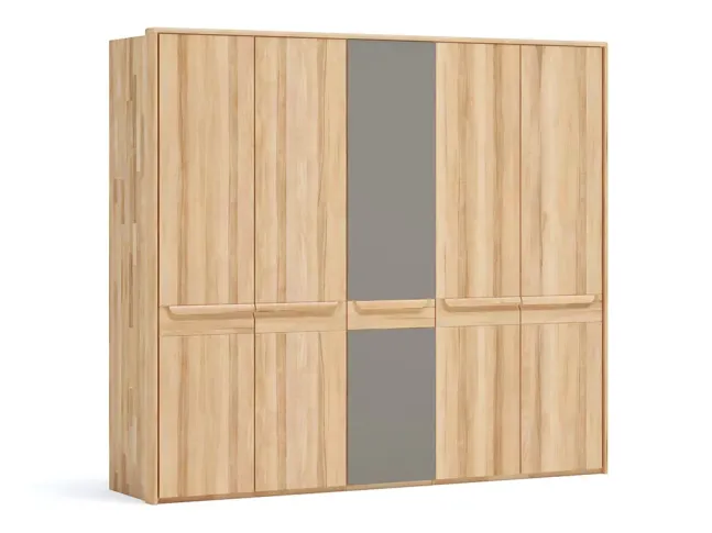 Шафа Глорія 5-дверна натурального кольору, матеріал зрощений/цільний бук, одна середня дверка скло матове сіре з паспарту