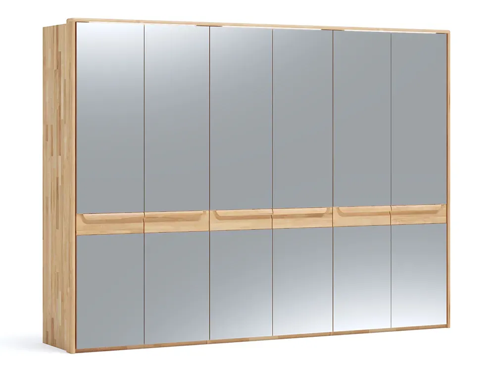 Шафа Глорія 6-дверна натурального кольору, матеріал зрощений/цільний бук, дверки дзеркало з паспарту та підсвіткою